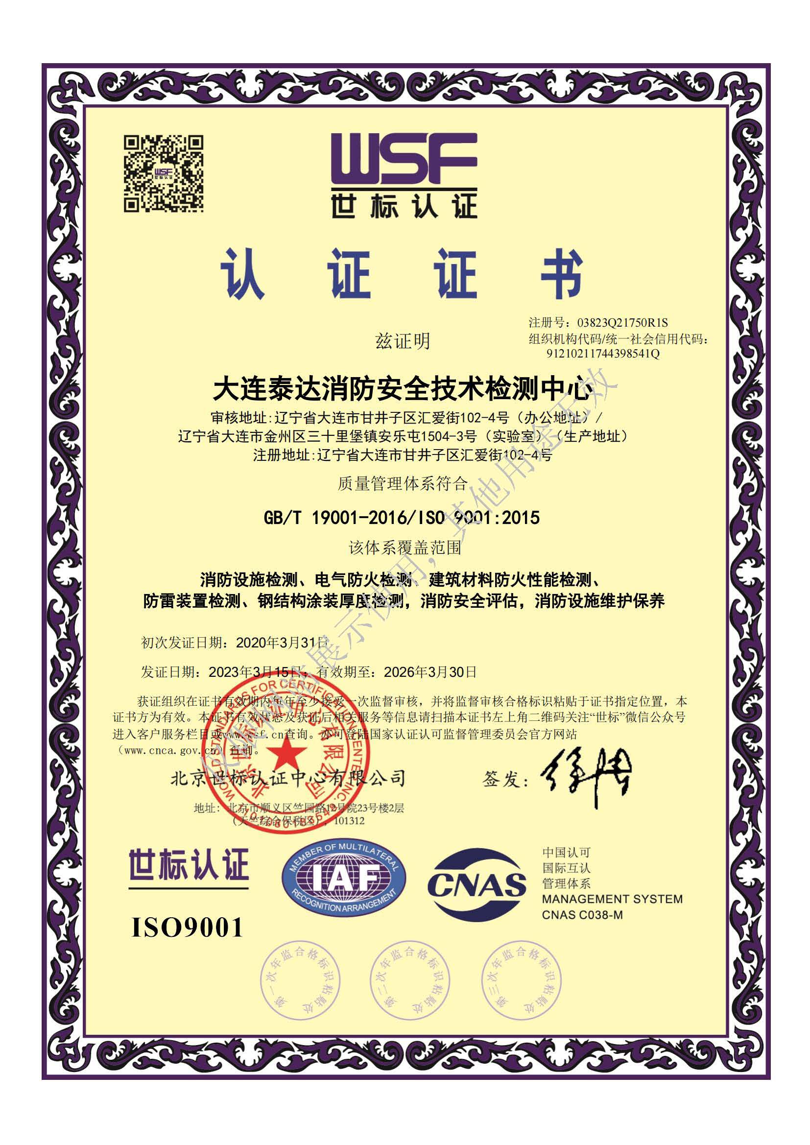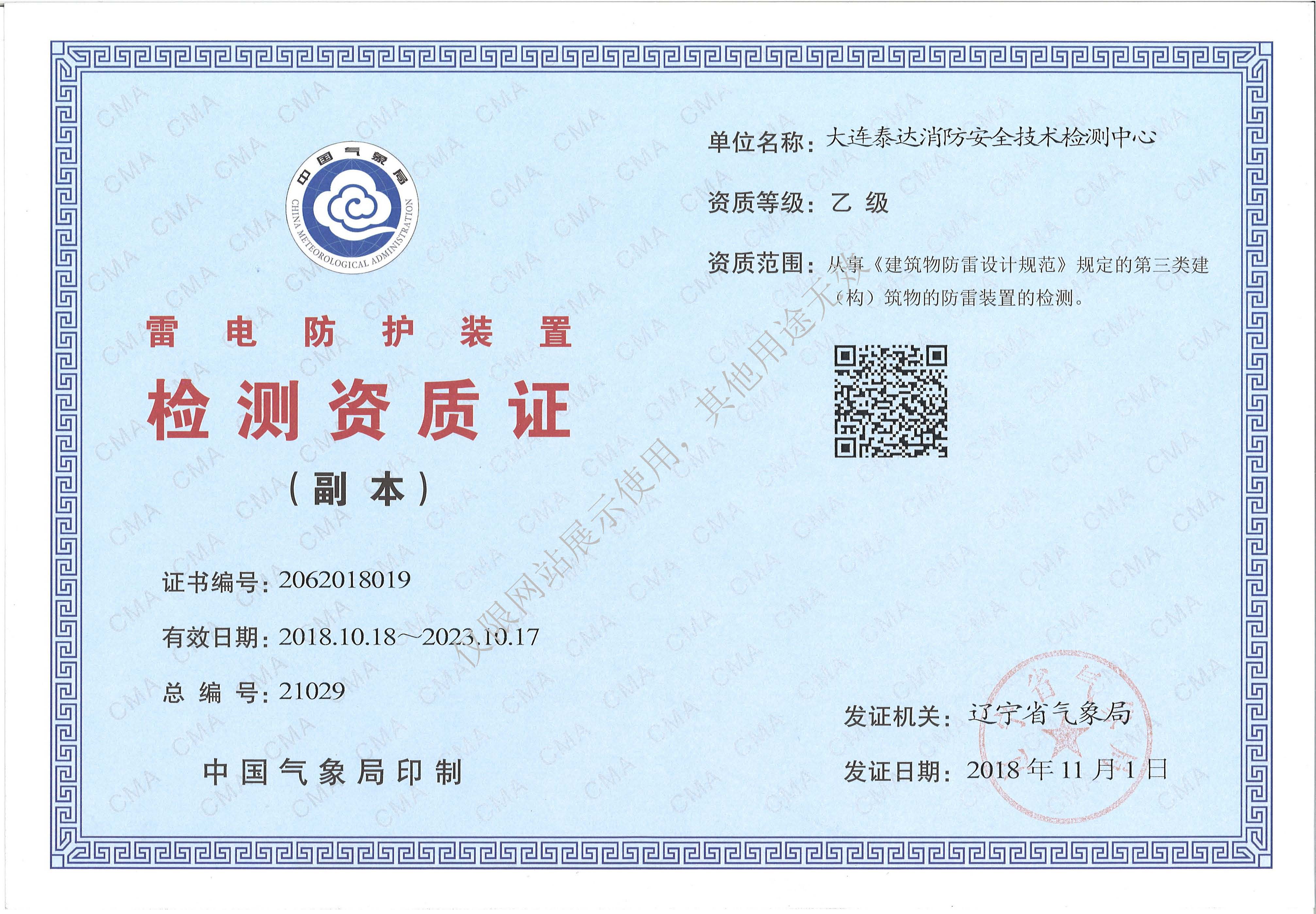 · 是經(jīng)“社會消防技術(shù)服務(wù)信息系統(tǒng)”備案并公示的消防技術(shù)服務(wù)機構(gòu),已取得中國氣象局頒發(fā)的雷電防護裝置檢測資質(zhì)證書、遼寧省質(zhì)量技術(shù)監(jiān)督局審核批準(zhǔn)的檢驗檢測機構(gòu)資質(zhì)認定證書(CMA)及包括消防檢測、電氣檢測、雷電防護裝置檢測、防火涂層厚度檢測等在內(nèi)的200余項檢驗檢測能力,取得大連市應(yīng)急管理局頒發(fā)的安全生產(chǎn)標(biāo)準(zhǔn)化證書,獲得質(zhì)量管理體系、環(huán)境管理體系、職業(yè)健康安全管理體系認證證書,是經(jīng)備案的高新技術(shù)企業(yè),可獨立出具具有證明作用的檢測報告。